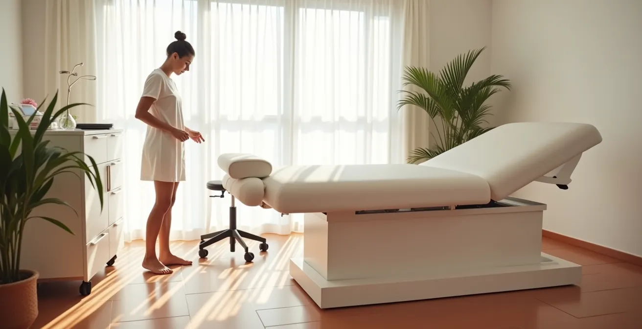 Como profesional de la salud o la estética, tu principal herramienta de trabajo no es el aparato de diatermia ni tus manos expertas; es tu propio cuerpo. Cada día, te inclinas, giras y aplicas presión, un esfuerzo físico que pasa factura. Por eso, la elección del mobiliario, y en especial de la camilla, trasciende la simple compra de un producto. No es una decisión para mejorar la experiencia del cliente, es una inversión estratégica en tu propia longevidad profesional. Solemos caer en el debate superficial de si es mejor una camilla hidráulica o una eléctrica, comparando precios y características como si comprásemos un electrodoméstico. Pero este enfoque es un error que puede costarte caro, no en dinero, sino en salud.
